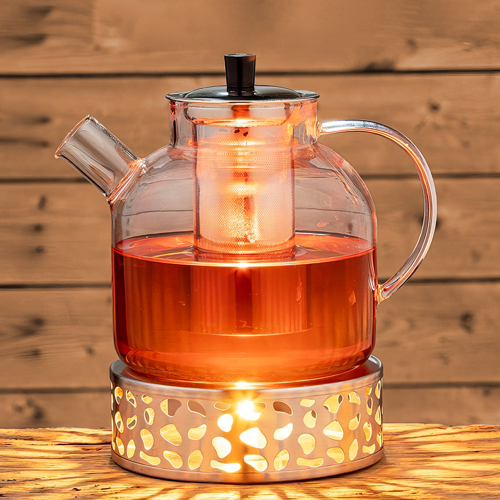 Heat-resistant glass teapot with removable stainless steel infuser. Safe for stovetop, microwave, and dishwasher. Non-drip spout and ergonomic handle.