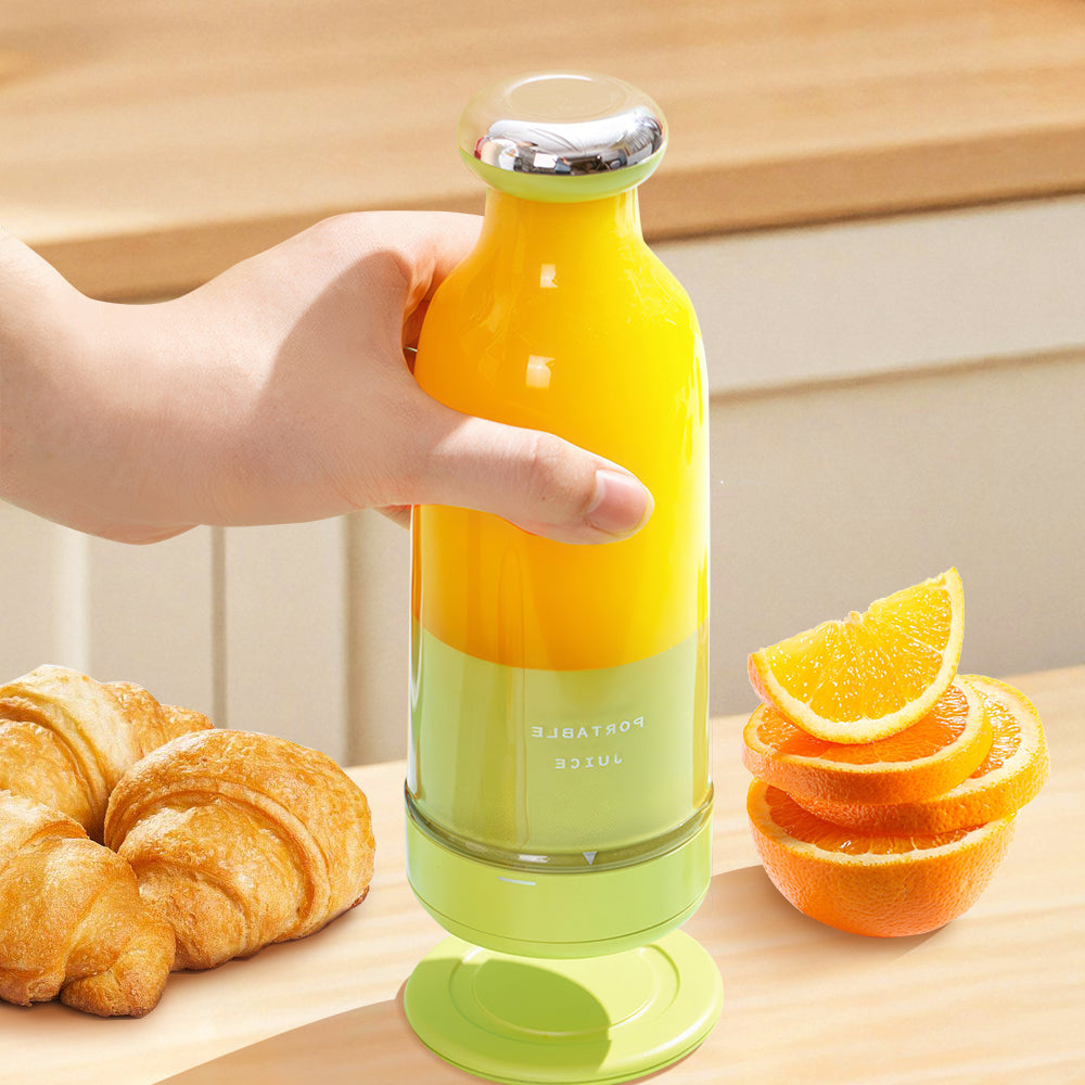 Compact blender with 6 stainless steel blades and 18,000 RPM motor. USB rechargeable with built-in battery. One-button cleaning and safety features.