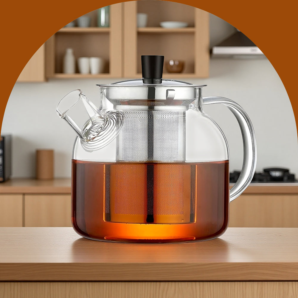 Heat-resistant glass teapot with removable stainless steel infuser. Safe for stovetop, microwave, and dishwasher. Non-drip spout and ergonomic handle.