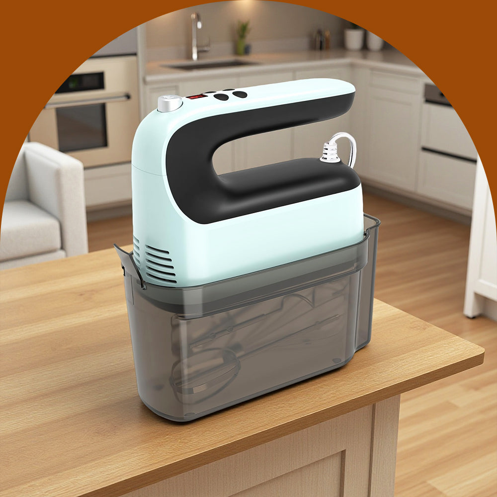 Hand mixer with 9 speeds and digital controls. Includes beaters, dough hooks, and whisk.