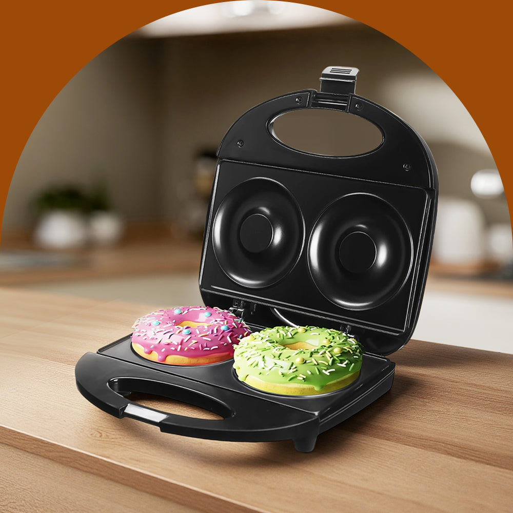 Electric donut maker for 2 mini donuts per batch. Compact design for simple operation.